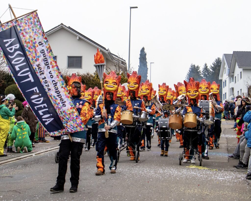 Es war der Goldkönigball Neuheim auf dem Plan, ein paar wilde gute und darunter auch eine bekannte Guggenmusik war am Start. Die Bänggner Sumpfhüener waren ebenfalls mit dabei als wir den kurzen Fackelumzug in Richtung Dorfplatz angingen.